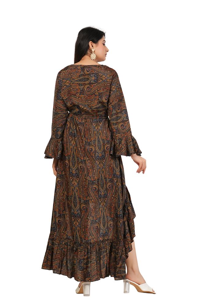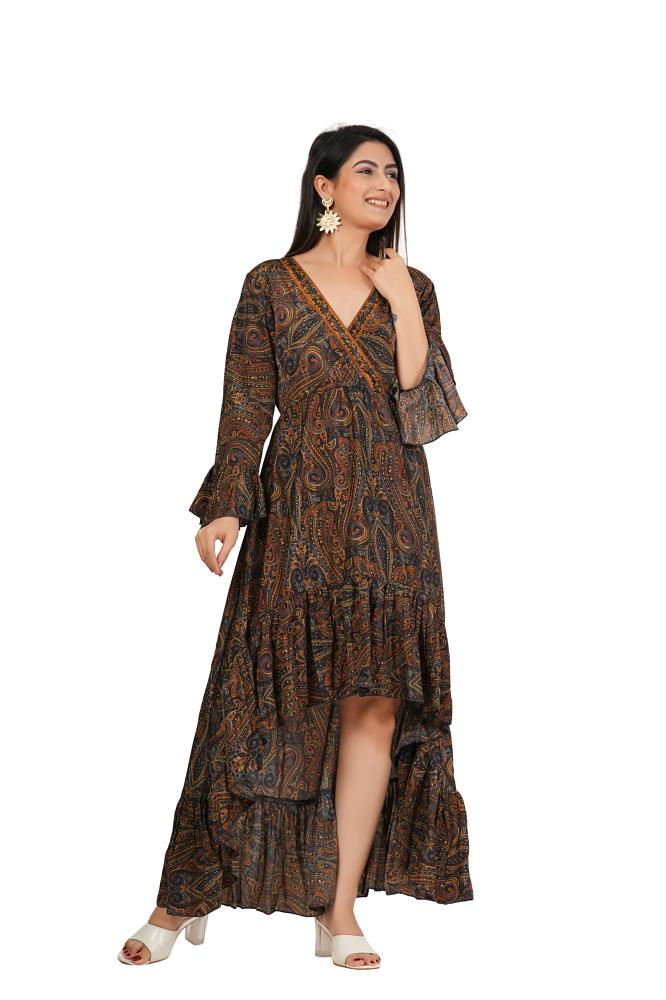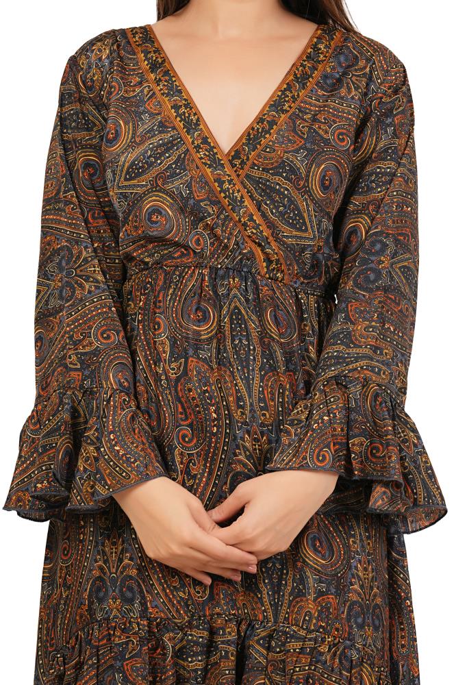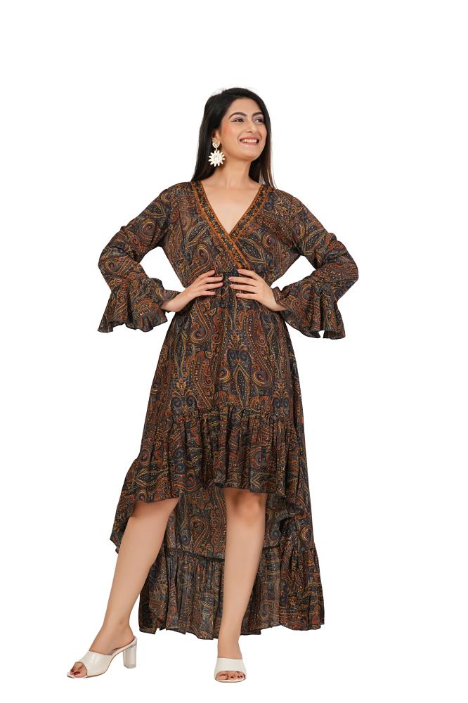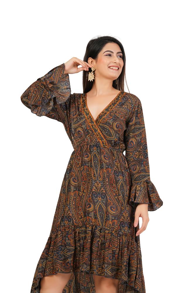 Turn heads with this stunning Kashmiri silk dress, beautifully inspired by the rich cultures of South East Asia. Crafted from soft, luxurious Kashmiri silk, the dress features an intricate paisley and floral motif in soothing tones of teal, navy, and gold. The halter neckline and flowy silhouette create an effortlessly elegant look, perfect for warm days, beachside escapes, or cultural events. Lightweight and breathable, this dress is a celebration of artisanal tradition and timeless style.