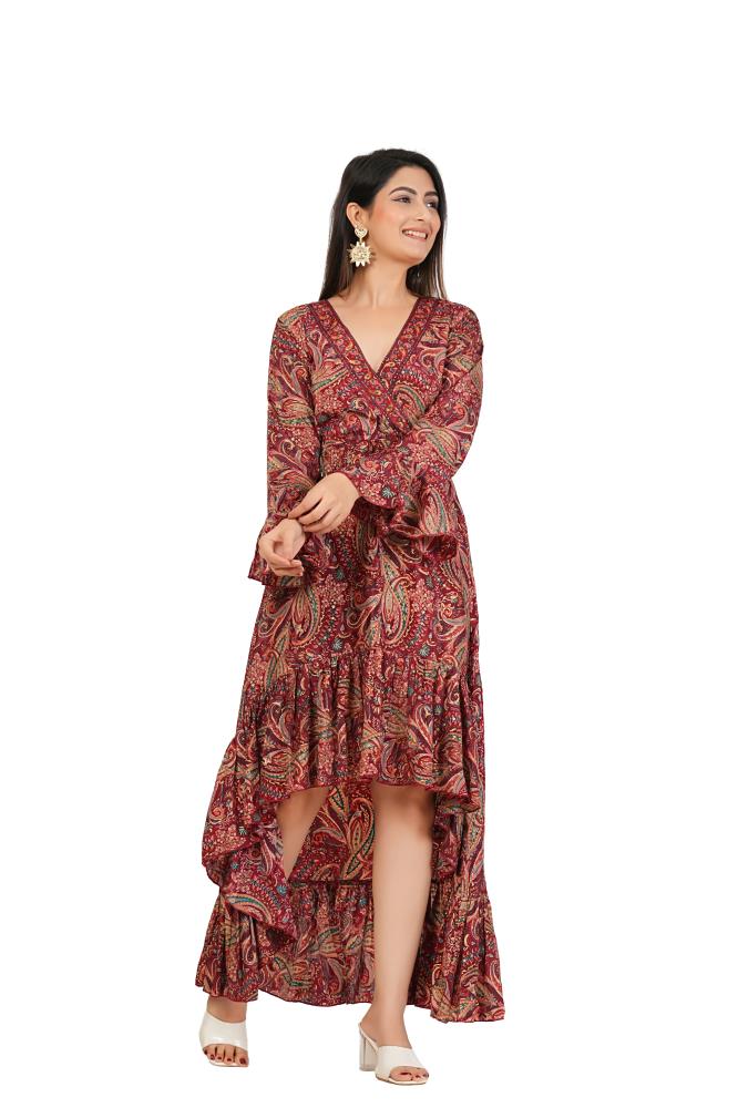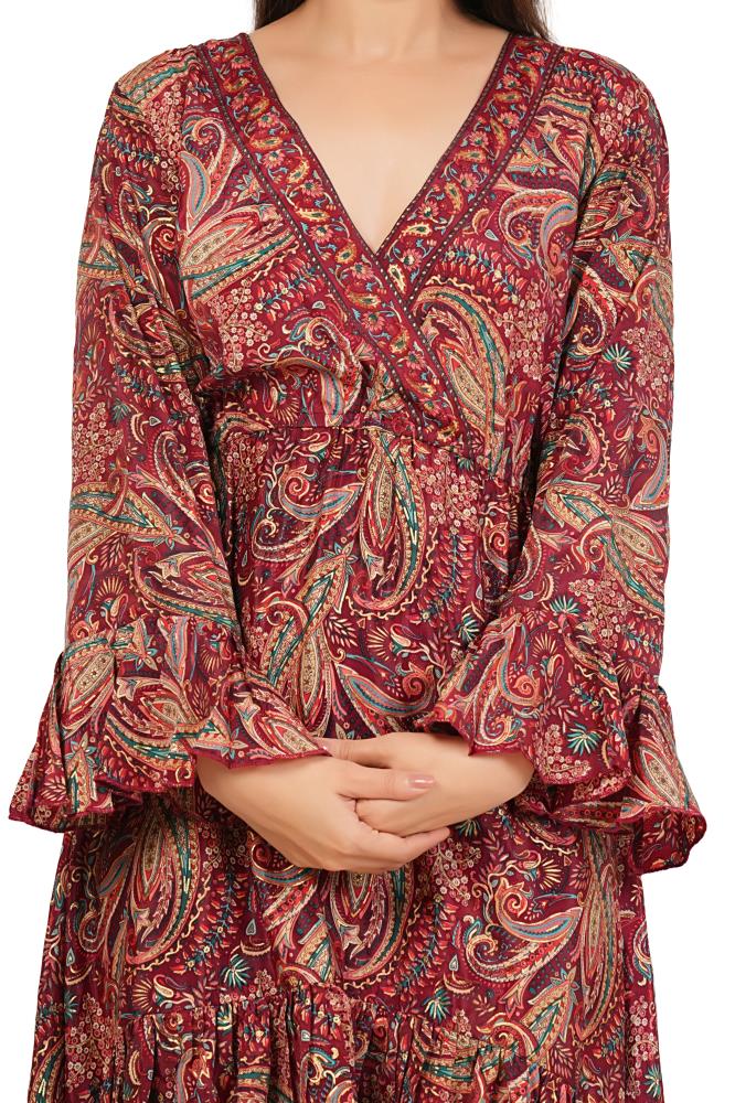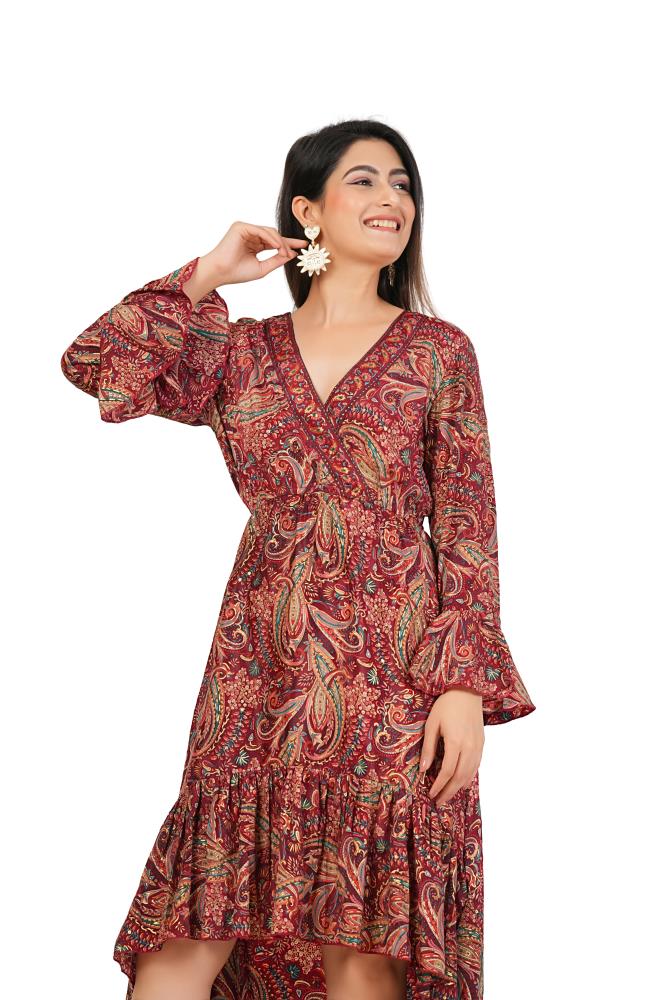 Turn heads with this stunning Kashmiri silk dress, beautifully inspired by the rich cultures of South East Asia. Crafted from soft, luxurious Kashmiri silk, the dress features an intricate paisley and floral motif in soothing tones of teal, navy, and gold. The halter neckline and flowy silhouette create an effortlessly elegant look, perfect for warm days, beachside escapes, or cultural events. Lightweight and breathable, this dress is a celebration of artisanal tradition and timeless style.