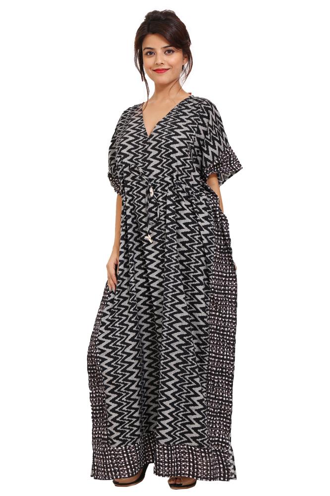 Lilashah Exports presents A Stylish Black Buds Kaftan With Pearls For Fashionable Women From The Kaftan Company. Featuring A Colourful And Eye-Catching Print All Over, This Dress Is Surely Not To Be Missed Out On. Lending You A Smart Look On Weekends, This Kaftan Dress Will Go Well With Trendy Flats.