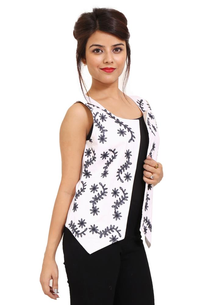 Solid White Cotton Party Wear Black Embroidery Jacket