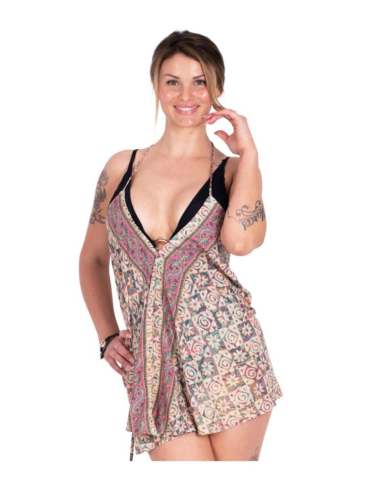 Extra Short Printed Dress and loose dress with a V-neckline and open back. Pattern forming squares in beige and pink among others