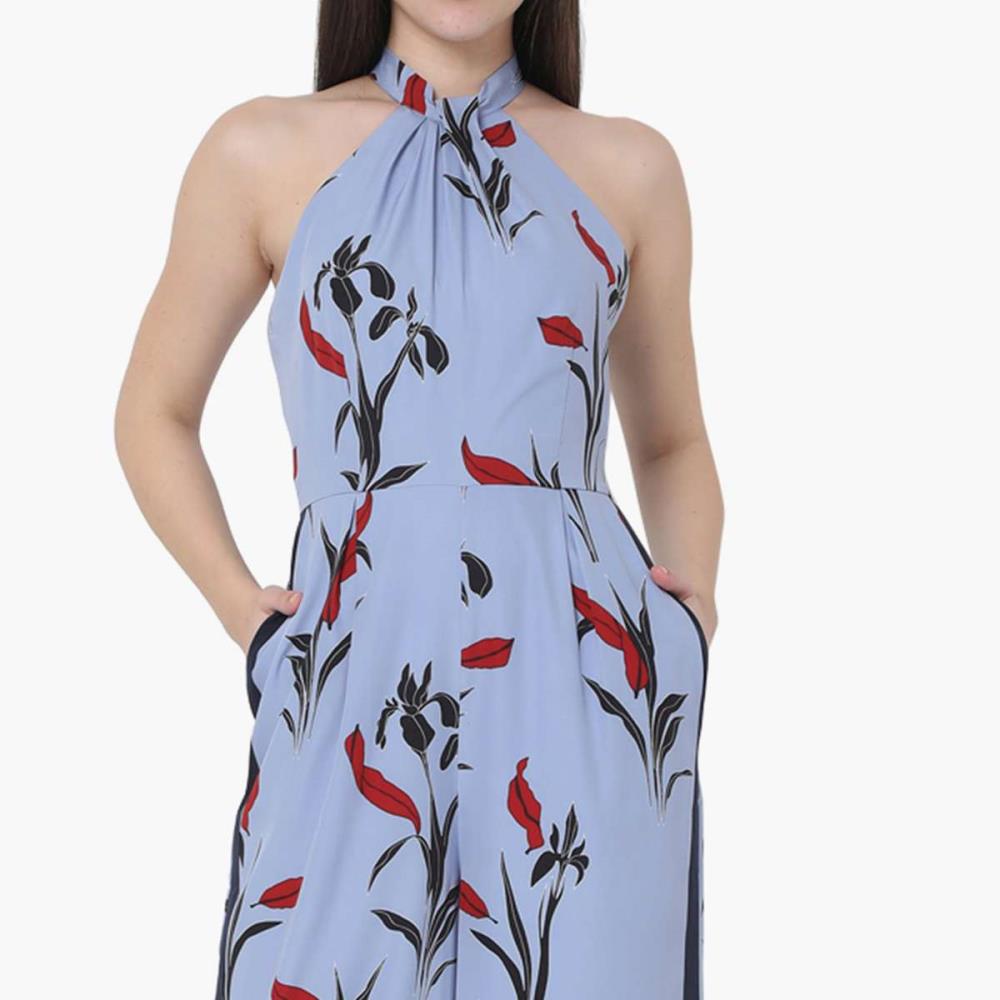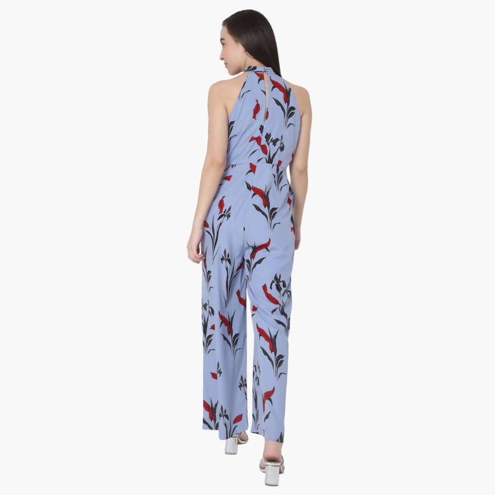his jumpsuit designed with a printed surface, a halter neckline, and a sleeveless silhouette